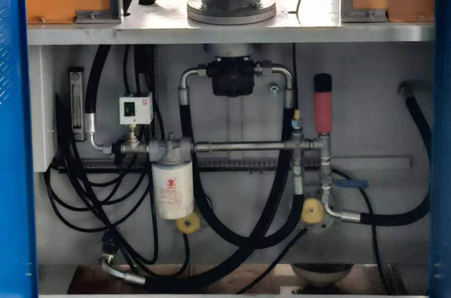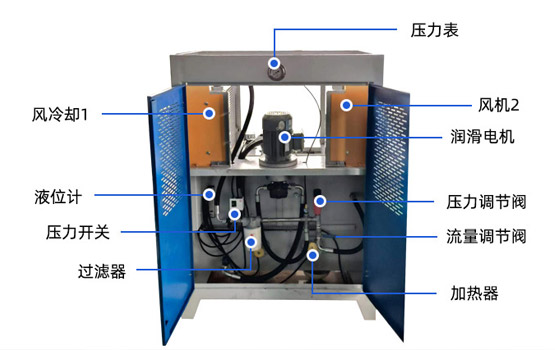潤(rùn)滑站由系統(tǒng)壓力表、壓力表開關(guān)、潤(rùn)滑電機(jī)、液位計(jì)、空氣過濾器、流量調(diào)節(jié)閥、壓力調(diào)節(jié)閥、加熱器、風(fēng)冷系統(tǒng)等結(jié)構(gòu)組成;空氣過濾器使空氣在油箱與大氣間循環(huán),保護(hù)液壓系統(tǒng)正常工作;通過壓力傳感器,進(jìn)行自動(dòng)控制;壓力表可以直觀的觀察系統(tǒng)壓力變化,設(shè)定系統(tǒng)需要的壓力值。