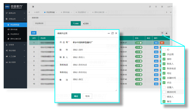 供應商檔案信息,包含客戶名稱、客戶簡稱、聯 系 人、聯系電話、聯系地址、備注等信息,支持客戶名稱查詢,還支持數據列篩選及導出功能。