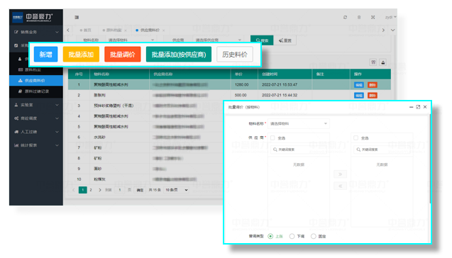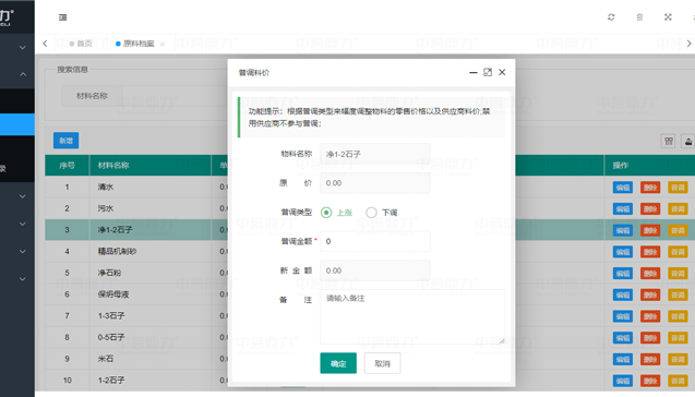 原料檔案記錄原料名稱、價格等信息,支持普調料價、原料禁用等,禁用后供應商不參與普調。